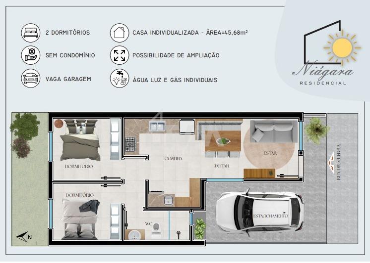 Casa geminadas de dois dormitórios, com conforto e praticidade para você morar ou investir. Vaga de garagem. Possibilidade de ampliação. 45.68m² privativos. água, luz e gás individualizados. Sem taxa de condomÃnio.